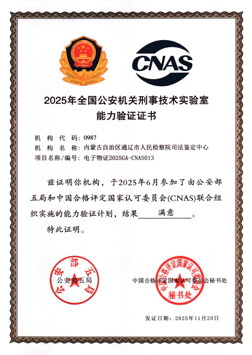 近日,通辽市检察院司法鉴定中心在2025年全国公安机关刑事技术实验室能力验证(盲测)活动中,报名参加的法医(死因鉴定)、文件检验(印章印文鉴定)、电子证据(电子物证鉴定)三项专业测试均获得最高评价“满意”,通辽市检察机关已连续8年荣获此项评价。