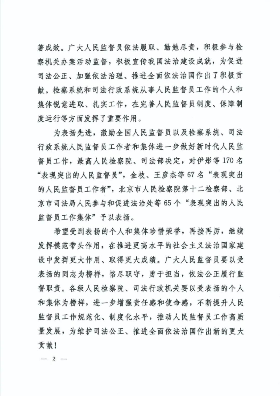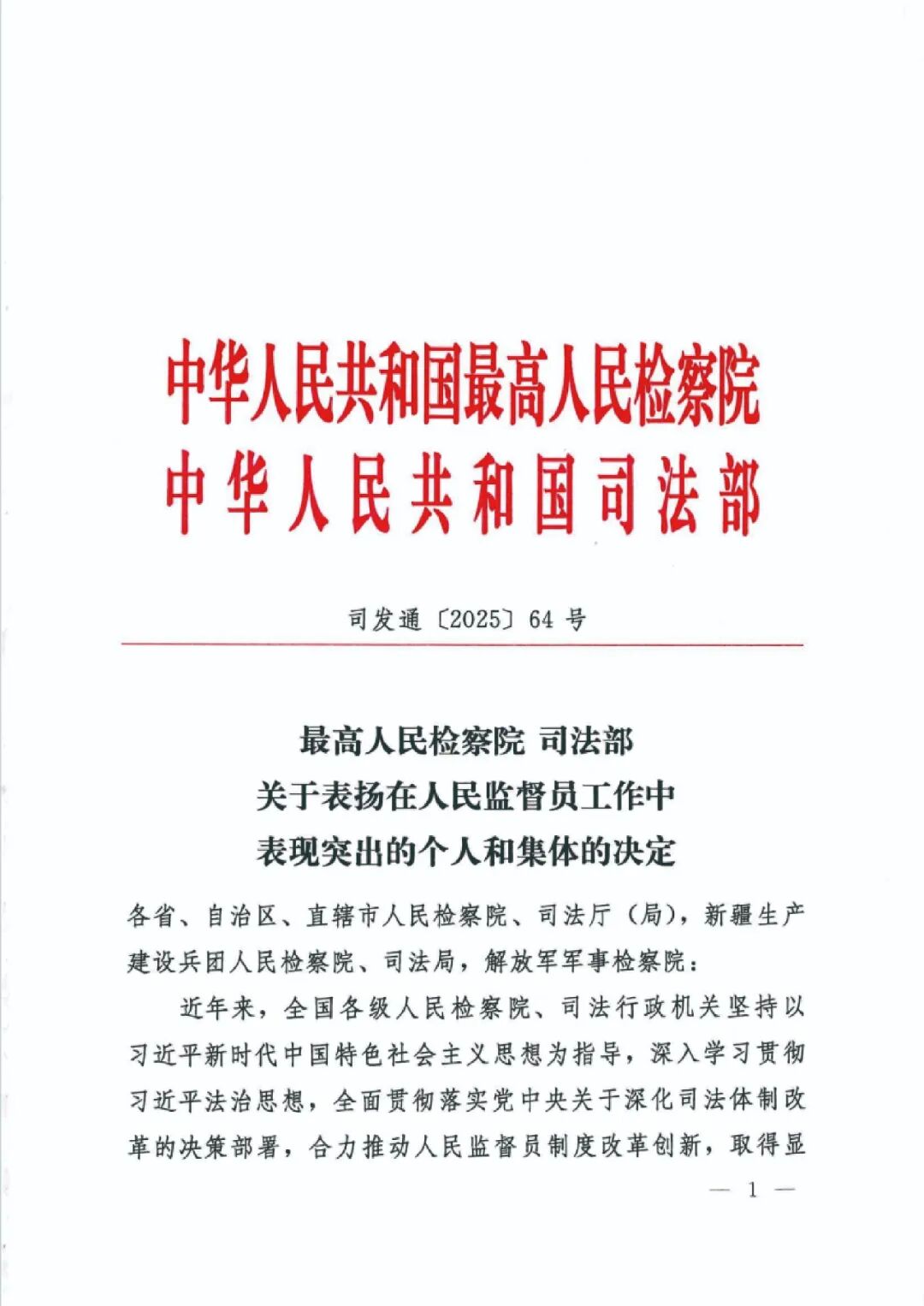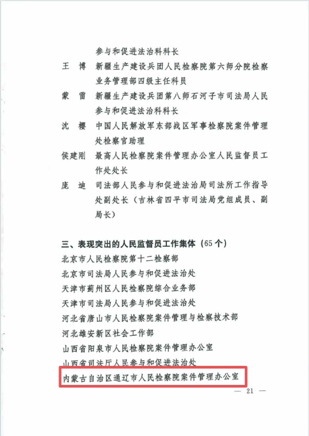 近日,最高人民检察院、司法部联合印发《关于表扬在人民监督员工作中表现突出的个人和集体的决定》,对65个“表现突出的人民监督员工作集体”、67名“表现突出的人民监督员工作者”、170名“表现突出的人民监督员”予以通报表扬。通辽市检察院案件管理办公室作为全区检察机关唯一受表彰集体,荣获“表现突出的人民监督员工作集体”。