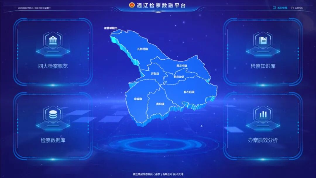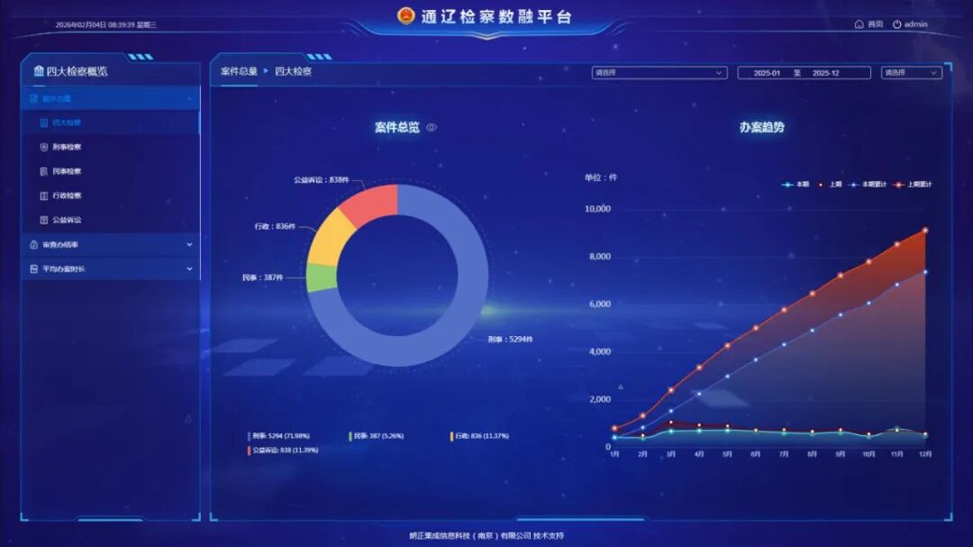 通辽检察数融平台以“1+4+N”模式为核心架构,集“四大检察概览”“检察数据库”“检察知识库”“办案质效分析”于一体,实现了检察工作全流程、全领域、全要素的数智化覆盖。平台深度整合刑事、民事、行政、公益诉讼等多部门数据资源,打破跨部门信息壁垒,通过统一数据接口和标准,实现数据自动收集、整理、分析与共享,为检察监督、办案质效分析等提供全面准确的信息支撑。