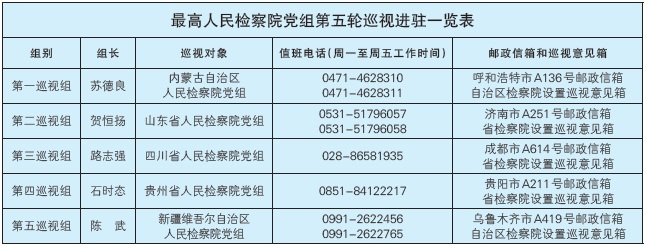 本报北京10月22日电(记者刘亭亭)根据最高人民检察院党组统一部署,最高检党组第五轮巡视分别对内蒙古、山东、四川、贵州、新疆5个省级检察院党组开展为期两个月的常规巡视。10月14日,最高检党组召开第五轮巡视动员部署会,其后开展了为期两天半的巡前培训。近日,各巡视组完成巡视进驻。
