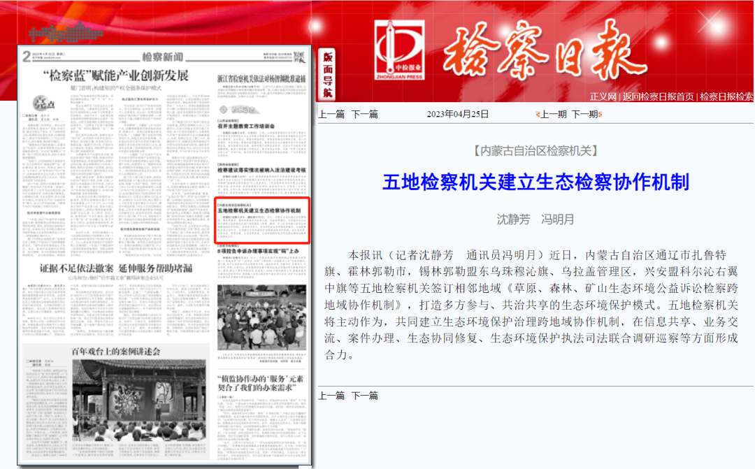 近日,内蒙古自治区通辽市扎鲁特旗、霍林郭勒市,锡林郭勒盟东乌珠穆沁旗、乌拉盖管理区,兴安盟科尔沁右翼中旗等五地检察机关签订相邻地域《草原、森林、矿山生态环境公益诉讼检察跨地域协作机制》,打造多方参与、共治共享的生态环境保护模式。五地检察机关将主动作为,共同建立生态环境保护治理跨地域协作机制,在信息共享、业务交流、案件办理、生态协同修复、生态环境保护执法司法联合调研巡察等方面形成合力。