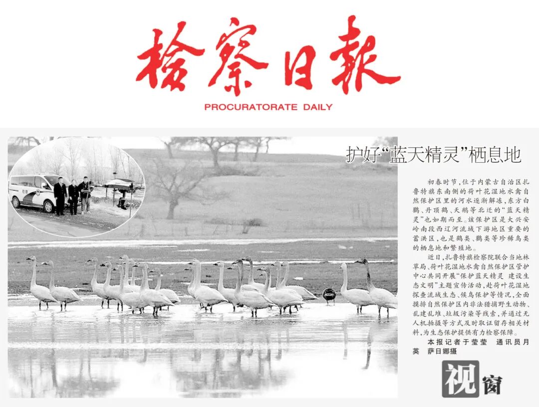 近日,扎鲁特旗检察院联合当地林草局、荷叶花湿地水禽自然保护区管护中心共同开展“保护蓝天精灵 建设生态文明”主题宣传活动,赴荷叶花湿地探查流域生态、候鸟保护等情况,全面摸排自然保护区内非法猎捕野生动物、乱建乱堆、垃圾污染等线索,并通过无人机拍摄等方式及时取证留存相关材料,为生态保护提供有力检察保障。