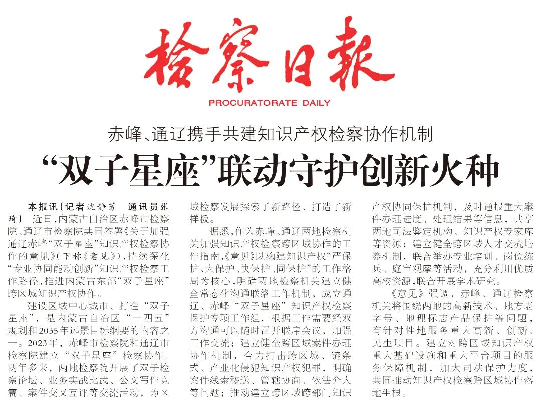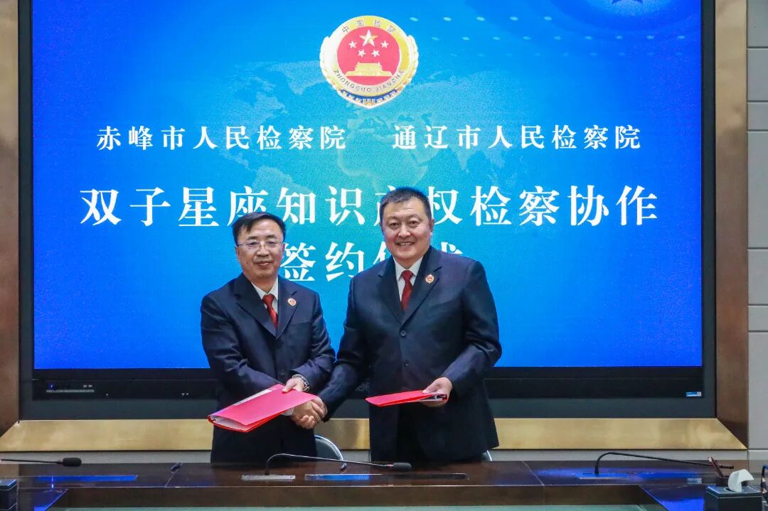 近日,内蒙古自治区赤峰市检察院、通辽市检察院共同签署《关于加强通辽赤峰“双子星座”知识产权检察协作的意见》(下称《意见》),持续深化“专业协同能动创新”知识产权检察工作路径,推进内蒙古东部“双子星座”跨区域知识产权协作。