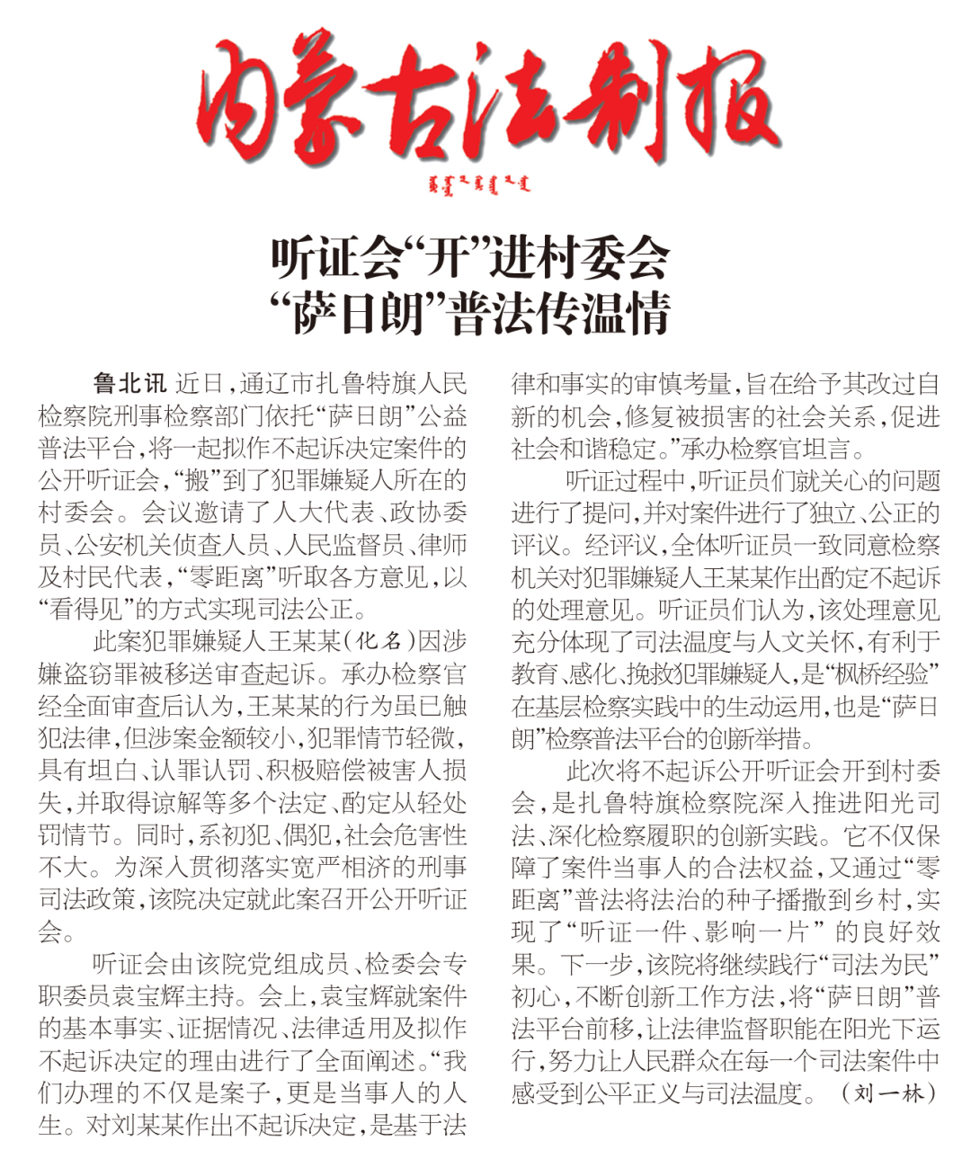 近日,通辽市扎鲁特旗检察院刑事检察部门依托“萨日朗”公益普法平台,将一起拟作不起诉决定案件的公开听证会,“搬”到了犯罪嫌疑人所在的村委会。会议邀请了人大代表、政协委员、公安机关侦查人员、人民监督员、律师及村民代表,“零距离”听取各方意见,以“看得见”的方式实现司法公正。