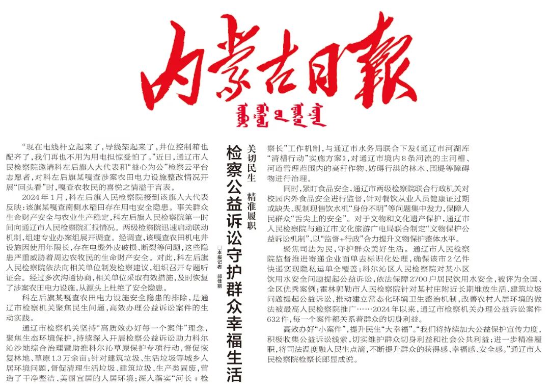 聚焦司法为民,守护群众美好生活。通辽市检察院监督推进寄递企业面单去标识化处理,确保该市2亿件快递实现隐私运单全覆盖;科尔沁区检察院对某小区饮用水安全问题提起公益诉讼,依法保障2700户居民饮用水安全,被评为全国、全区优秀案例;霍林郭勒市检察院针对某村庄附近长期堆放生活、建筑垃圾问题提起公益诉讼,推动建立常态化环境卫生整治机制,改善农村人居环境的做法被最高人民检察院推广……2024年以来,通辽市检察机关办理公益诉讼案件632件,每一个案件都关系着群众的切身利益。