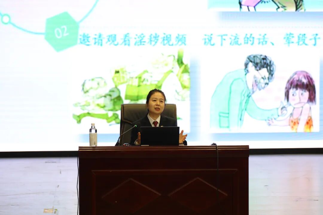 校园本是阳光成长的沃土,但欺凌、侵害等潜在风险仍需警惕。丁晓丽主任以真实案例为切入点、以法律知识为核心支撑,围绕“防性侵、校园欺凌、常见多发的罪名”三大关键内容,为学生层层拆解安全知识、传授应对方法。针对校园欺凌,她通过区分欺凌行为的表现形式,引导学生如何预防和应对欺凌行为。围绕“防范性侵害”,她没有回避敏感话题,而是用清晰的逻辑、易懂的语言,结合真实案例,揭开性侵害的“多样面孔”,破除了“性侵害实施者仅为男性”以及“熟人绝对安全”等认知误区。她还特别强调了网络交友安全,提示学生们注意保护个人隐私,不轻易相信陌生网友。讲座尾声,丁晓丽还向全体学生殷切寄语:珍视这段“青葱”岁月,既要学会自控、主动担当责任,更要掌握自护技能、守护自身安全,让青春在法治护航下健康前行。