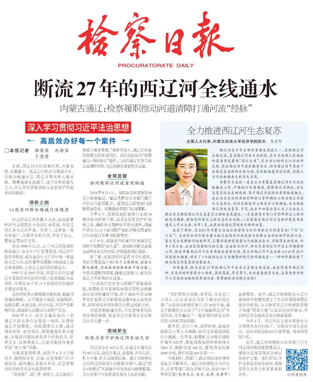 我还了解到,自2023年内蒙古自治区检察院与水利部松辽水利委员会(下称“松辽委”)、自治区水利厅联合建立松辽流域水行政执法与检察公益诉讼协作机制以来,各方充分发挥协作机制作用,汇聚形成检察监督与行政执法合力,并取得良好成效。今年5月以来,自治区检察院与松辽委、自治区水利厅,针对当前西辽河干流主河槽禁种工作,联合开展西辽河干流专项执法监督行动,重点对西辽河干流全线403公里28个河段进行抽查,移交了5个疑似违反主河槽禁种规定的问题线索……种种举措体现了助力西辽河复苏的检察担当。