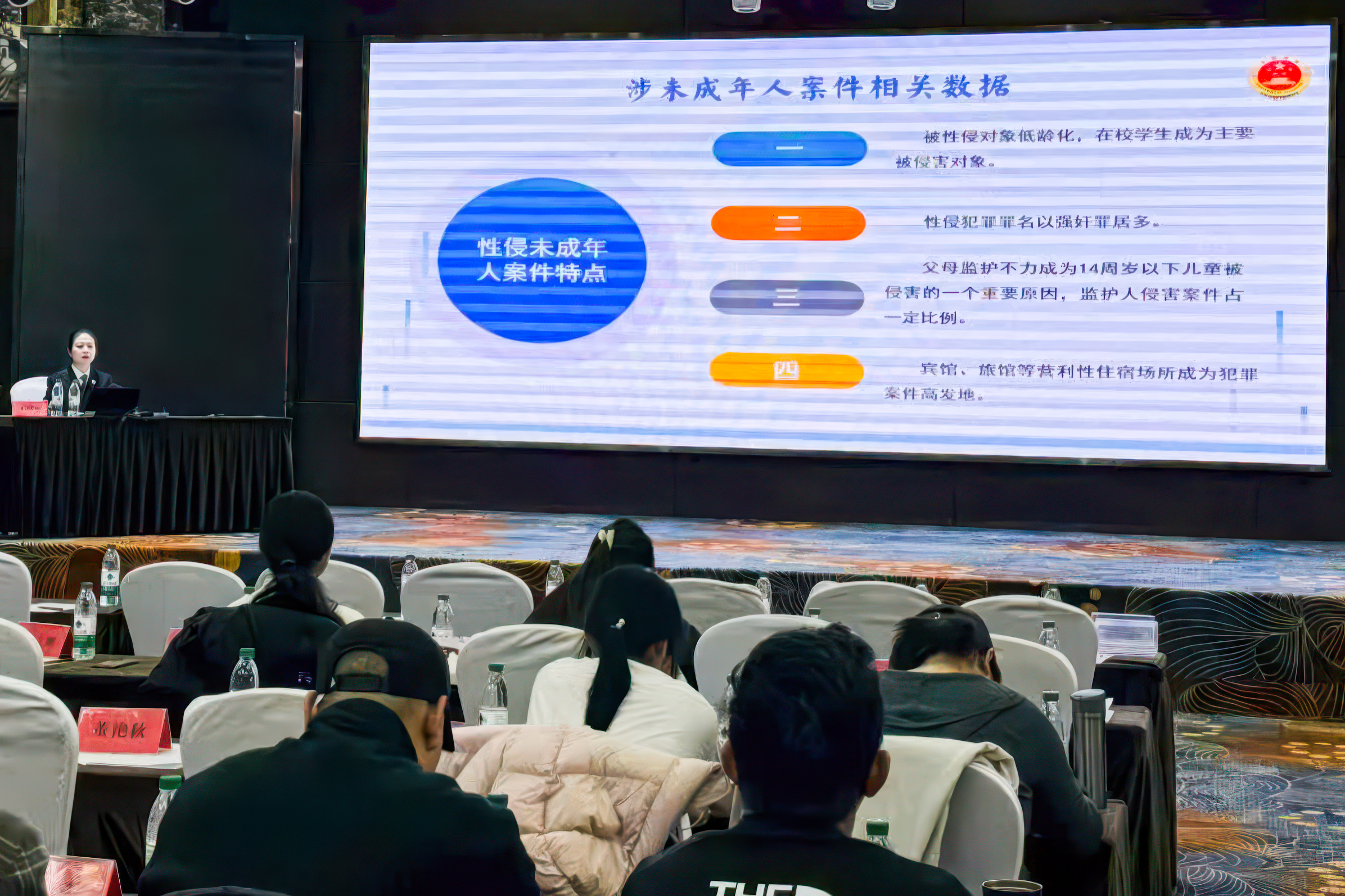 讲座中,丁晓丽以全国及全市检察机关近年来办理的涉未成年人案件数据情况为切入点,详细阐述了此类案件的基本情况与特点,围绕“预防性侵害、法治副校长的职责任务、未成年人常见多发的犯罪类型三个维度,结合典型案例进行精准解读。通过剖析辖区未成年人犯罪现状,丁晓丽引导教育工作者深刻认识抓好未成年人犯罪预防工作的重要性和必要性,并结合学校教育管理实际,提出了具体的预防措施与应对方法,强调学校需切实履行主体责任,将法治教育与安全管理融入日常教学,筑牢校园安全“第一道防线”。