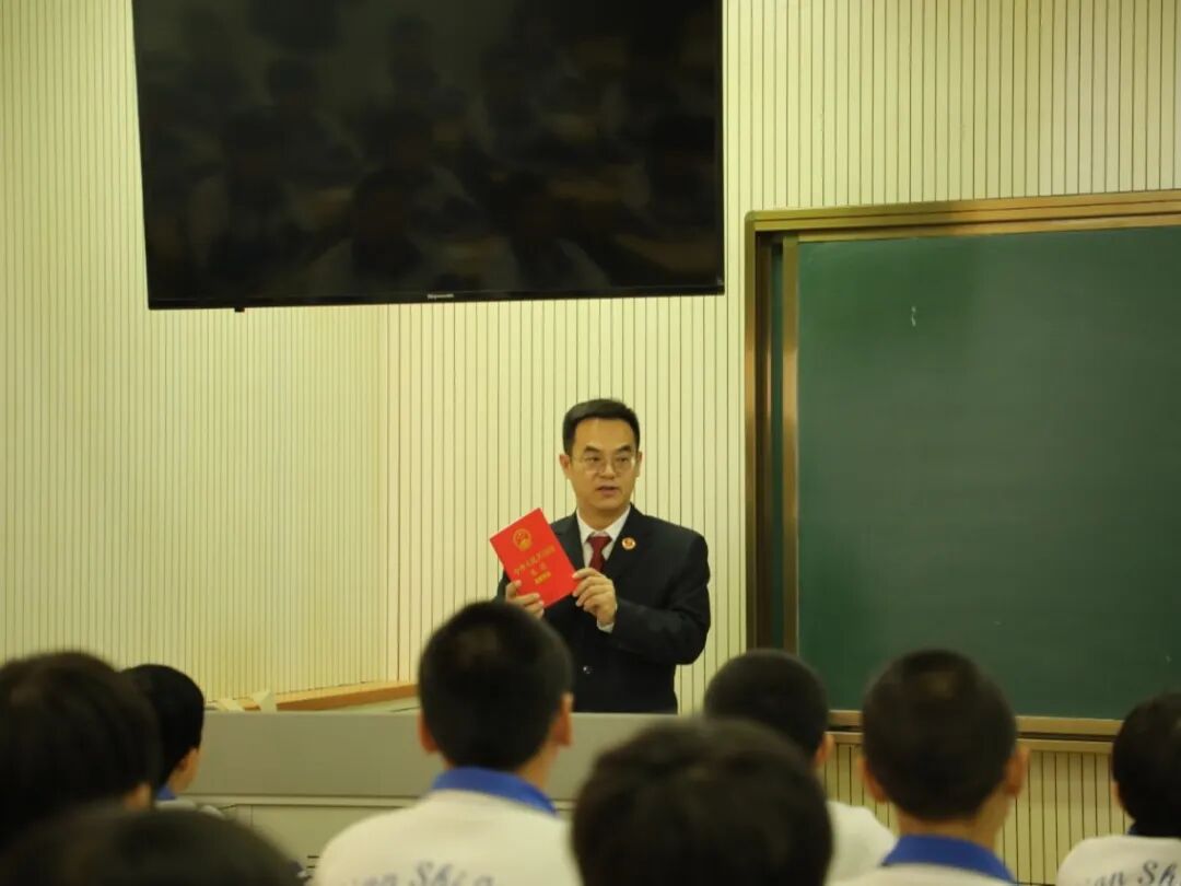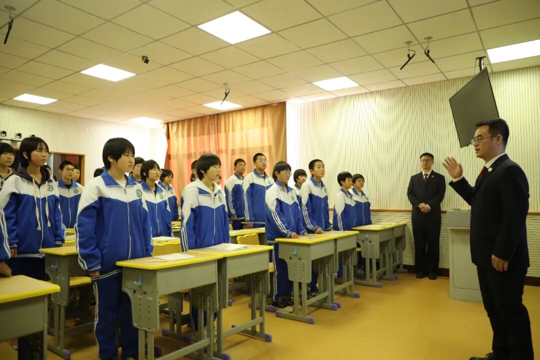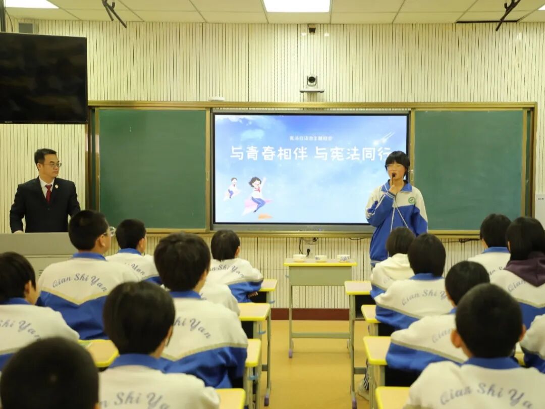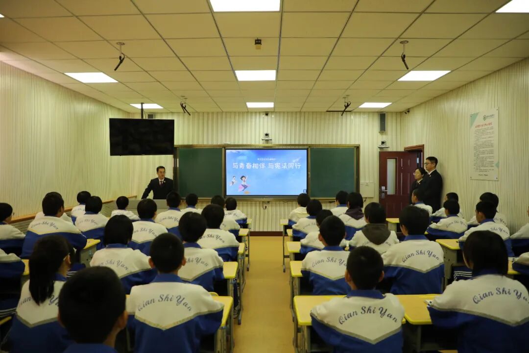 为落实全市校园法治实践教育全覆盖统一行动,在第十个宪法日即将到来之际,通辽市检察院党组书记、检察长郎显成受邀来到钱家店实验初中,开展以“与青春相伴 与宪法同行”为题的宪法日法治主题班会,班会以“现场+录播”的方式供全校1500余名师生观看。